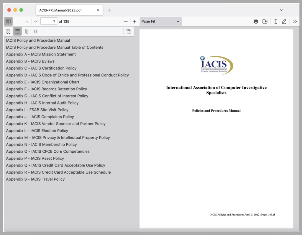 The IACIS Policies and Procedures Manual is a comprehensive collection of all IACIS policies in one document, for convenience.