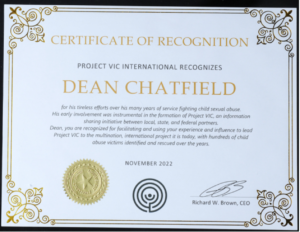 2010-2012 – While working liaison with Microsoft’s Digital Crime Unit, I was introduced to a new product Microsoft had developed called Photo DNA. I immediately realized the value to law enforcement officers investigating child exploitation investigations. I saw it as a unique tool to quickly indentify known child sexual exploitation images, but also to quickly filter other images in the same area of the storage media, and identify previously unseen images, thus identifying new victims. These new victims could be researched and identified in hopes of recovering them from their abusive environment. After negotiating with Microsoft and developing a proof of concept program, I was awarded a grant in 2012, for the proof of concept. This proof of concept was developed into what is now known as Project VIC. In 2017, while attending a ICAC Commanders Meeting, I attended a presentation by Project VIC where they indicated that one federal computer crime lab, deploying the protocol I developed in the proof of concept, had identified and recovered over 2000 new victims in the previous year. In 2022, Project VIC International recognized my work in developing the protocols and proof of concept which became Project VIC by awarding me a Project VIC Certificate of Recognition plaque.